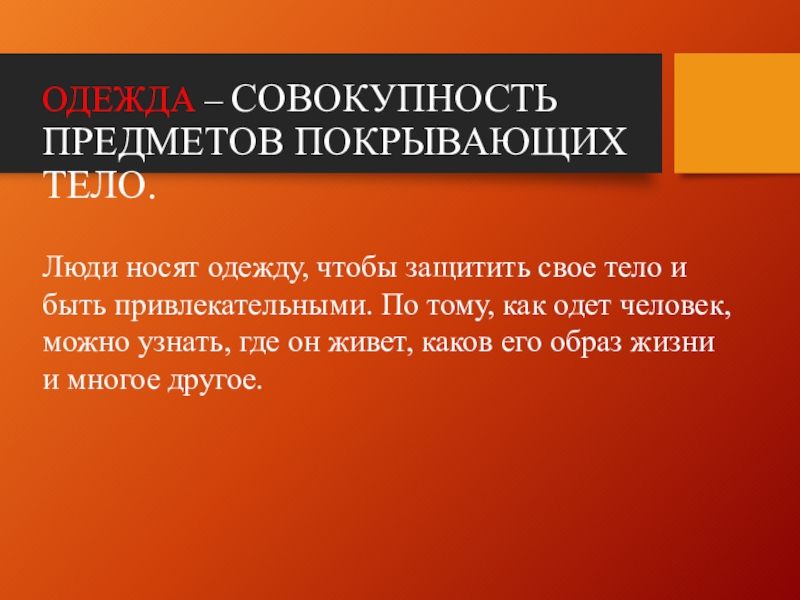 ОДЕЖДА – СОВОКУПНОСТЬ ПРЕДМЕТОВ ПОКРЫВАЮЩИХ ТЕЛО.Люди носят одежду, чтобы защитить свое тело и быть привлекательными. По тому,
