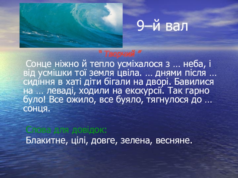 Сонце ніжно й тепло усміхалося з … неба, і від усмішки тої земля цвіла. … днями після … сидіння в хаті діти бігали на дворі. Бавилися на … леваді, ходили на екскурсії. Так гарно було! Все ожило, все буяло, тягнулося до … сонця.