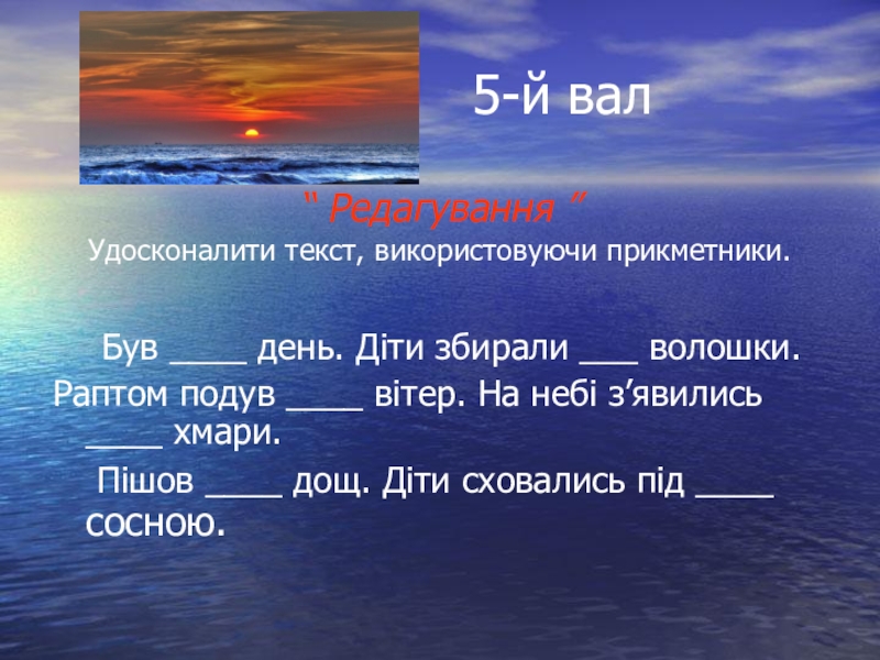 Раптом подув ____ вітер. На небі з’явились ____ хмари.