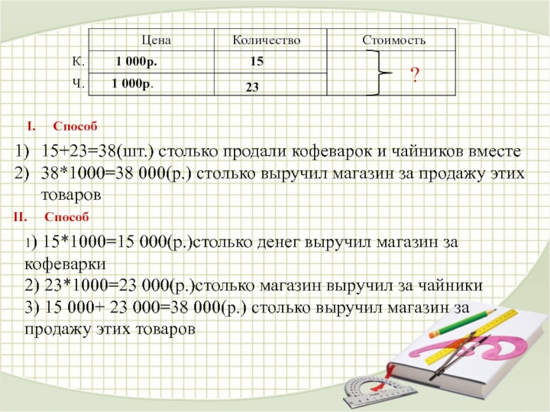 3) 15 000+ 23 000=38 000(р.) столько выручил магазин за продажу этих товаров