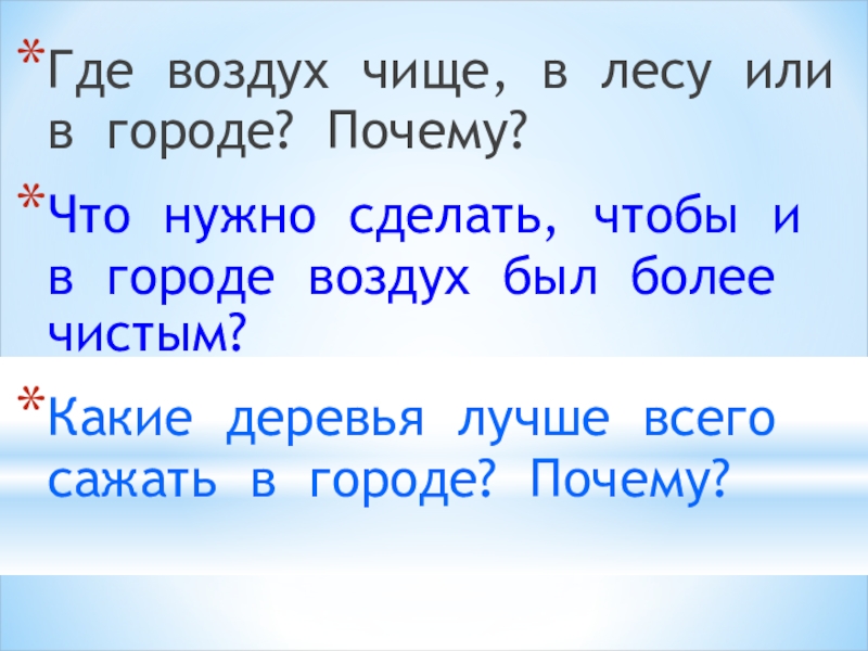 Где воздух чище, в лесу или в городе? Почему?Что нужно сделать, чтобы и в городе воздух был