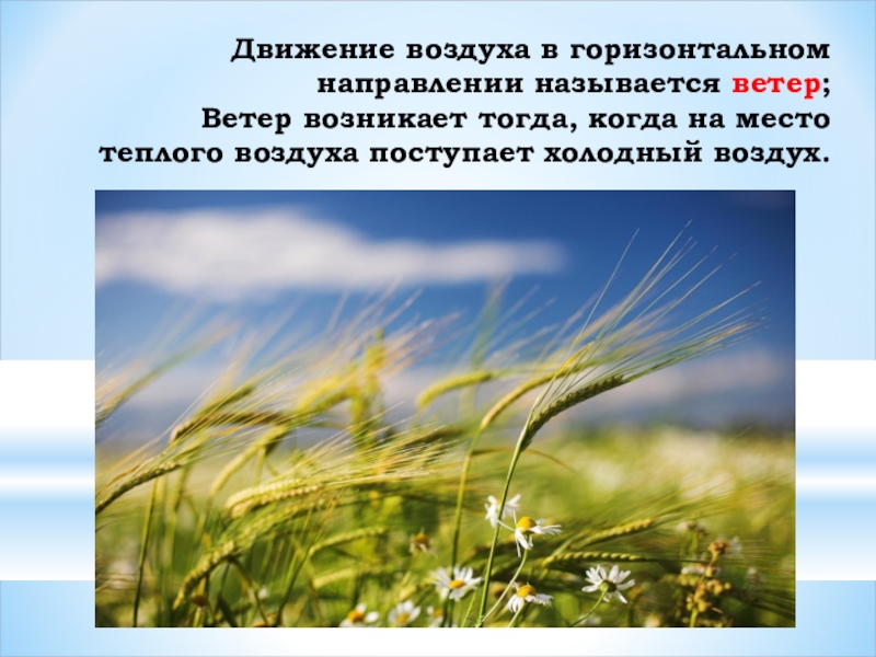 Движение воздуха в горизонтальном направлении называется ветер; Ветер возникает тогда, когда на место теплого воздуха поступает холодный