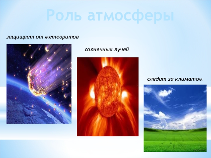Роль атмосферызащищает от метеоритовсолнечных лучейследит за климатом