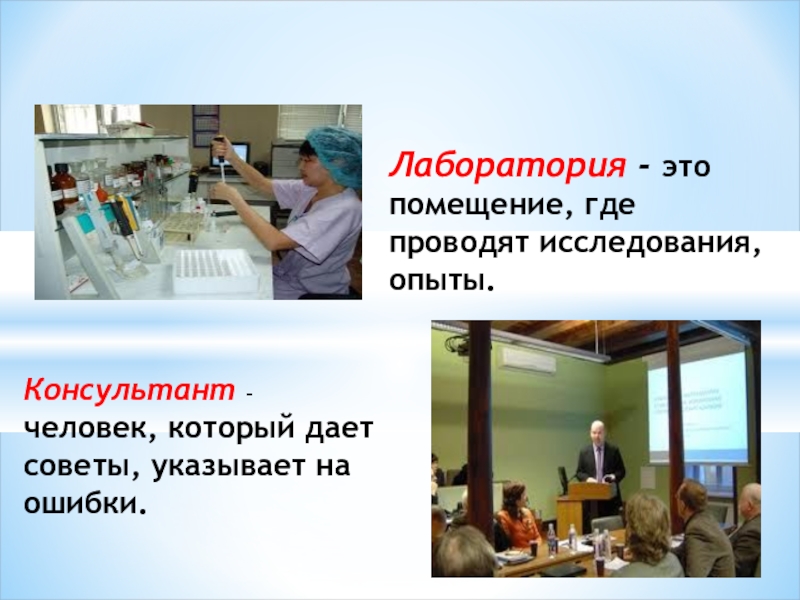 Лаборатория - это помещение, где проводят исследования, опыты. Консультант - человек, который дает советы, указывает на