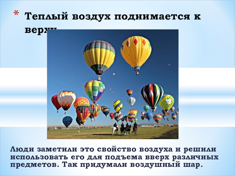 Теплый воздух поднимается к верхуЛюди заметили это свойство воздуха и решили использовать его для подъема вверх различных