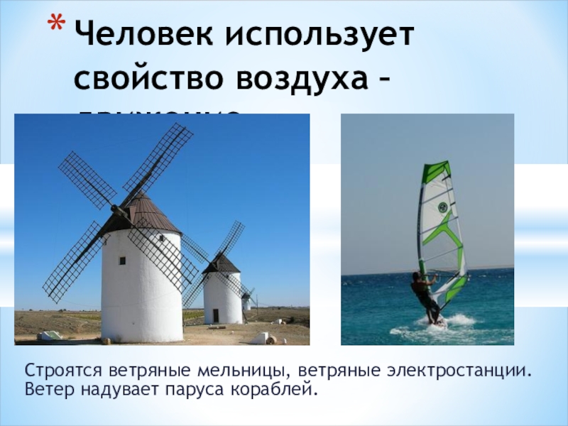 Человек использует свойство воздуха – движение.Строятся ветряные мельницы, ветряные электростанции. Ветер надувает паруса кораблей.