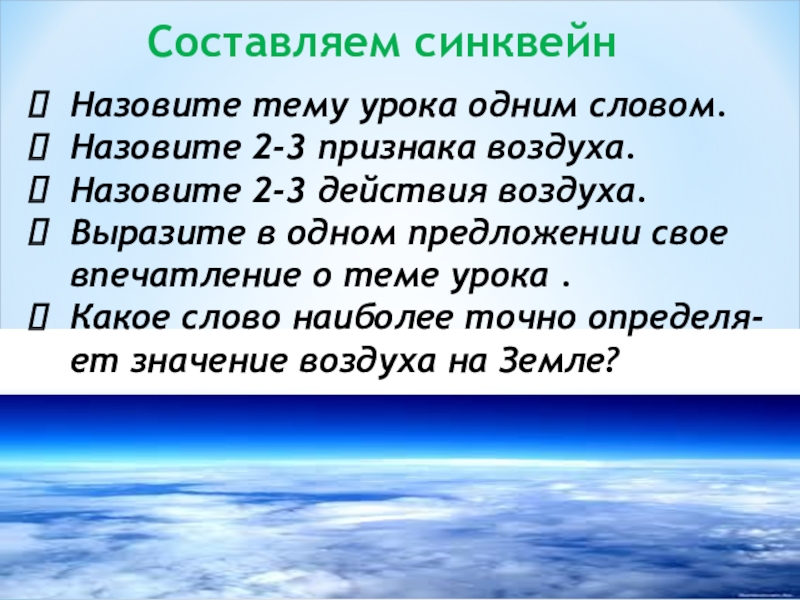 Составляем синквейнНазовите тему урока одним словом.Назовите 2-3 признака воздуха.Назовите 2-3 действия воздуха.Выразите в одном предложении свое впечатление