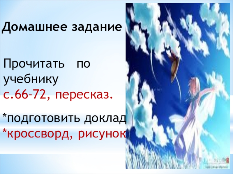 Домашнее заданиеПрочитать  по  учебнику с.66-72, пересказ. *подготовить доклад*кроссворд, рисунок