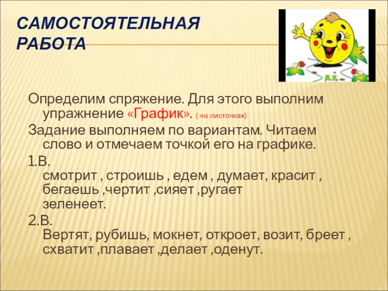 Определим спряжение. Для этого выполним упражнение «График». ( на листочках)