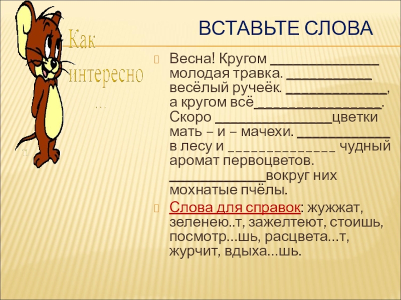 Весна! Кругом ______________ молодая травка. ___________ весёлый ручеёк. _____________, а