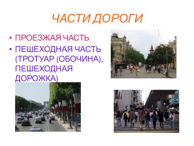 ЧАСТИ ДОРОГИПРОЕЗЖАЯ ЧАСТЬПЕШЕХОДНАЯ ЧАСТЬ (ТРОТУАР (ОБОЧИНА), ПЕШЕХОДНАЯ ДОРОЖКА)