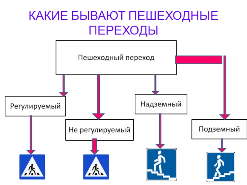 Слайд 10КАКИЕ БЫВАЮТ ПЕШЕХОДНЫЕ ПЕРЕХОДЫ