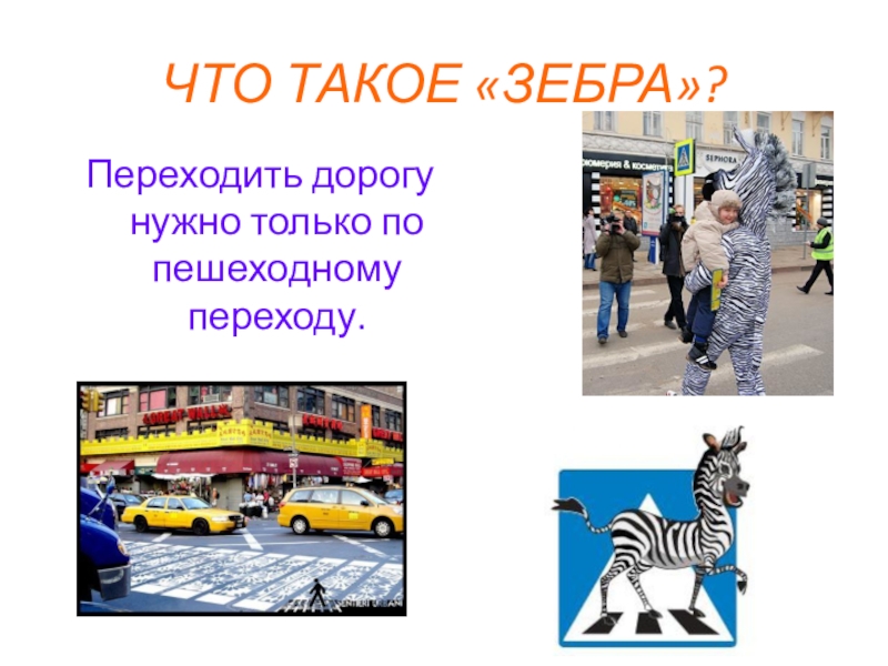 ЧТО ТАКОЕ «ЗЕБРА»?Переходить дорогу нужно только по пешеходному переходу.