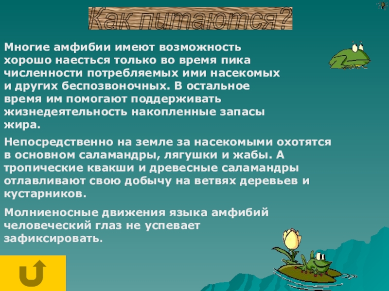 Многие амфибии имеют возможность хорошо наесться только во время пика численности потребляемых ими насекомых и других беспозвоночных. В остальное время им помогают поддерживать жизнедеятельность накопленные запасы жира.