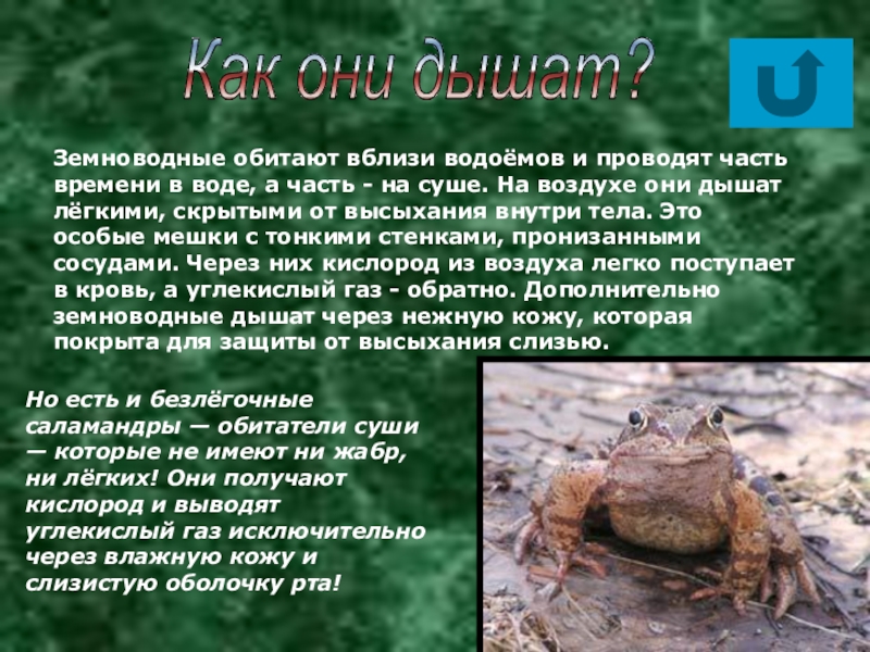 Но есть и безлёгочные саламандры — обитатели суши — которые не имеют ни жабр, ни лёгких! Они получают кислород и выводят углекислый газ исключительно через влажную кожу и слизистую оболочку рта!