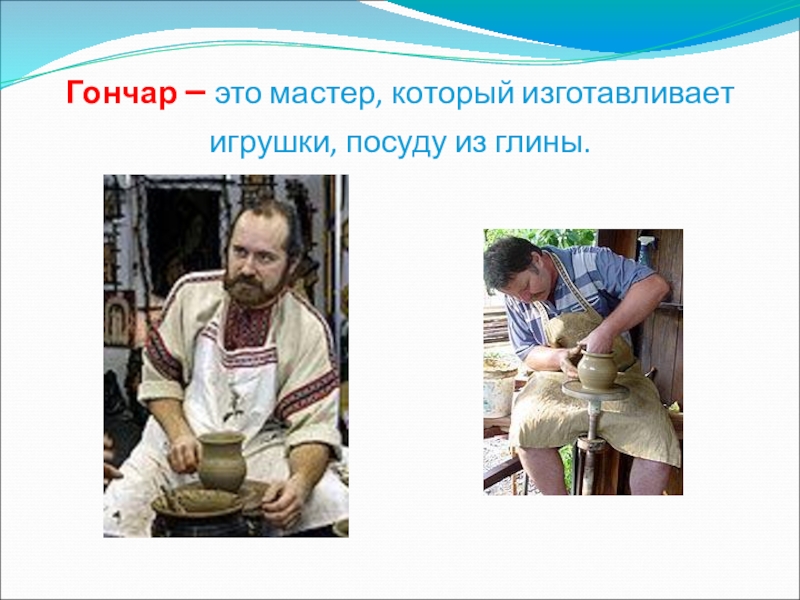Слайд 13Гончар – это мастер, который изготавливает игрушки, посуду из глины.
