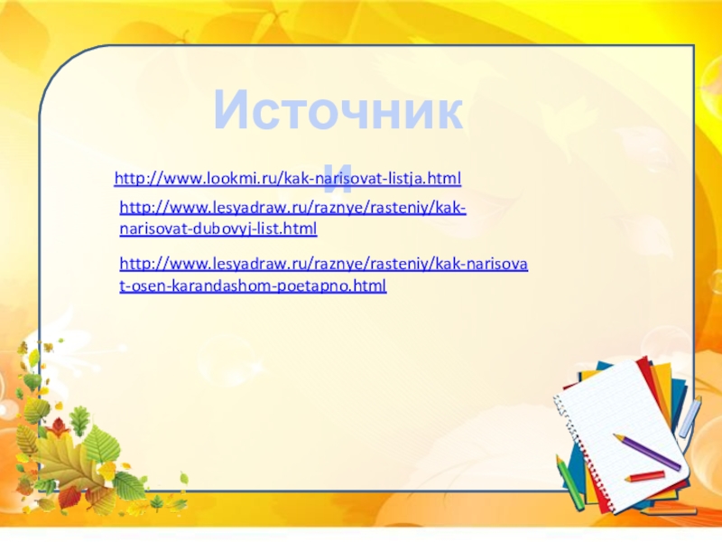 Источники http://www.lookmi.ru/kak-narisovat-listja.html http://www.lesyadraw.ru/raznye/rasteniy/kak-narisovat-osen-karandashom-poetapno.html http://www.lesyadraw.ru/raznye/rasteniy/kak-narisovat-dubovyj-list.html