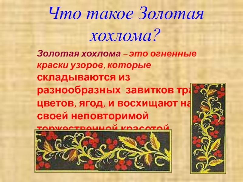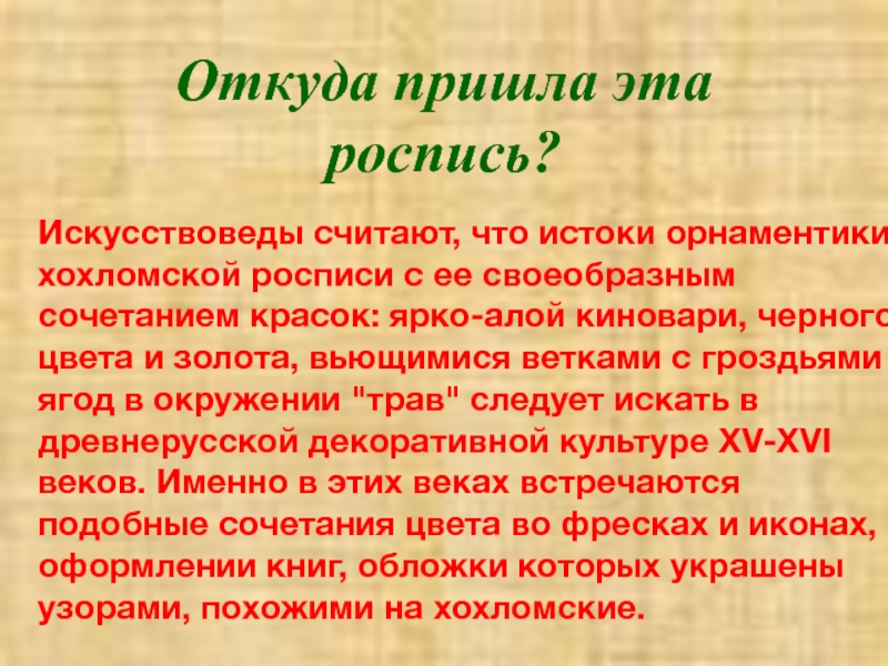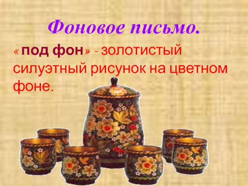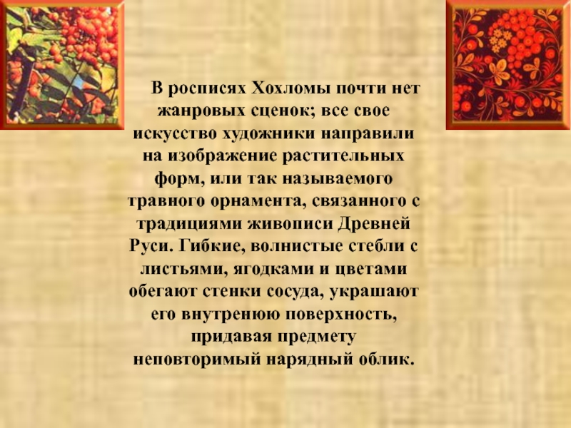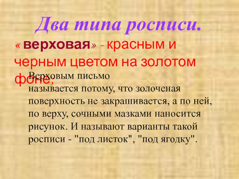Верховым письмо называется потому, что золоченая поверхность не закрашивается, а по ней, по верху, сочными мазками наносится рисунок. И называют варианты такой росписи - "под листок", "под ягодку".