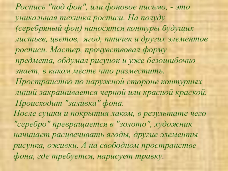 После сушки и покрытия лаком, в результате чего "серебро" превращается в "золото", художник начинает расцвечивать ягоды, другие элементы рисунка, оживки. А на свободном пространстве фона, где требуется, нарисует травку.