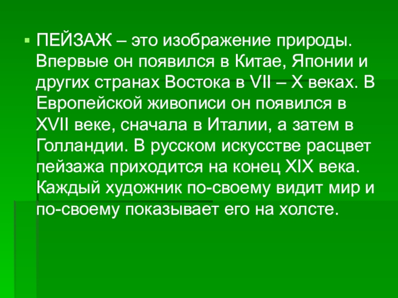 и других странах Востока в VII – X веках. В Европейской живописи он появился в XVII веке, сначала в Италии, а затем в Голландии. В русском искусстве расцвет пейзажа приходится на конец XIX века. Каждый художник по-своему видит мир и по-своему показывает его на холсте.