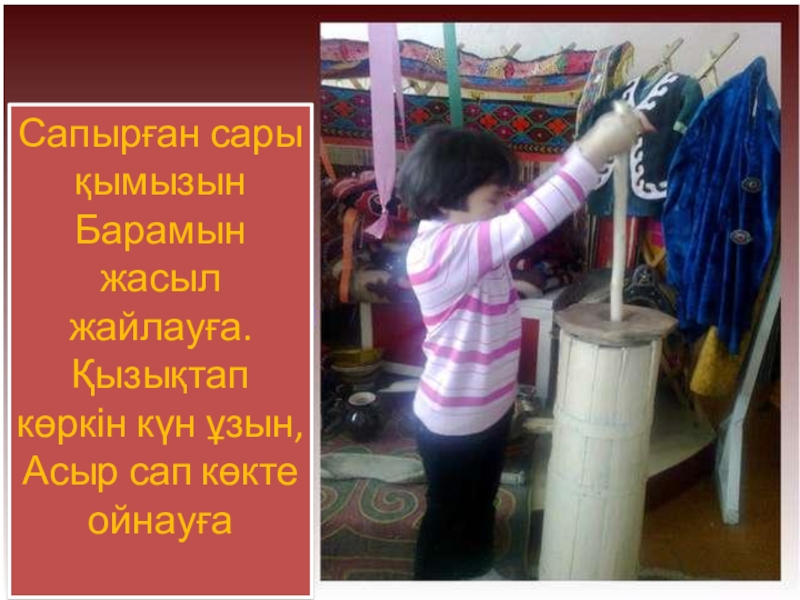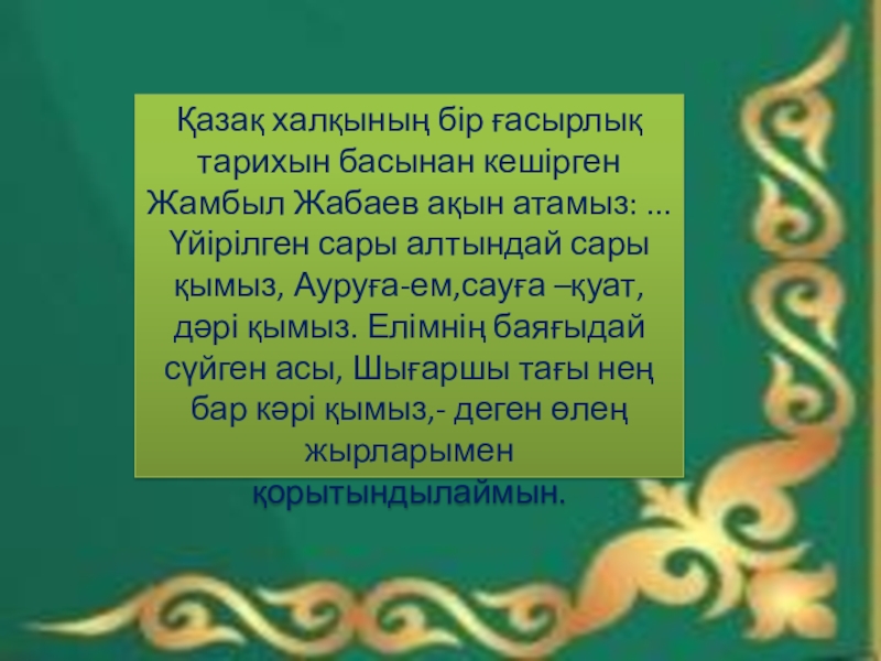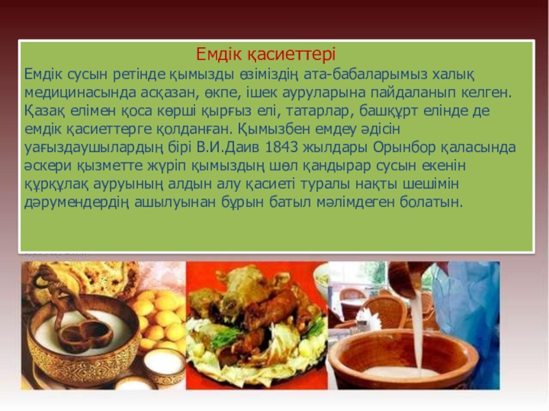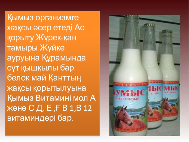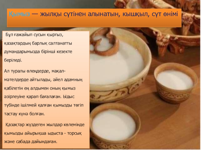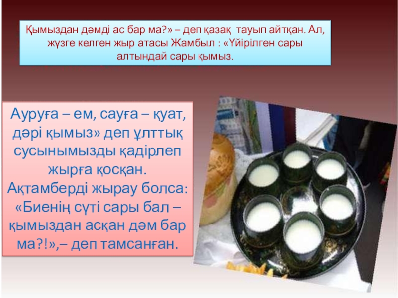 Ауруға – ем, сауға – қуат, дәрі қымыз» деп ұлттық сусынымызды қадірлеп жырға қосқан. Ақтамберді жырау болса: «Биенің сүті сары бал – қымыздан асқан дәм бар ма?!»,– деп тамсанған.