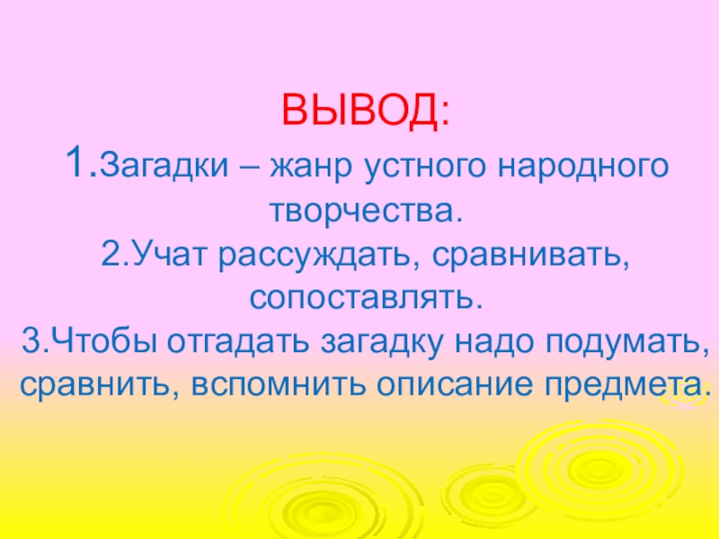Слайд 10ВЫВОД: 1.Загадки – жанр устного народного творчества. 2.Учат рассуждать, сравнивать, сопоставлять. 3.Чтобы отгадать