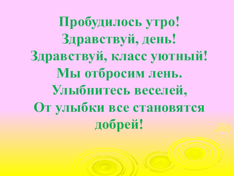 Слайд 2Пробудилось утро! Здравствуй, день! Здравствуй, класс уютный! Мы отбросим лень. Улыбнитесь веселей, От улыбки все становятся