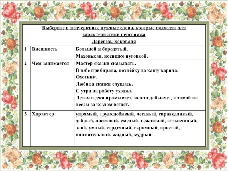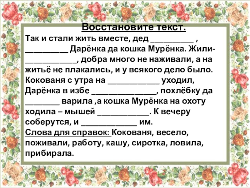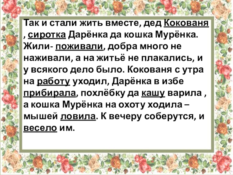 Так и стали жить вместе, дед __________ , __________ Дарёнка да кошка Мурёнка. Жили- ____________, добра много не наживали, а на житьё не плакались, и у всякого дело было. Кокованя с утра на ____________ уходил, Дарёнка в избе _______________, похлёбку да ________ варила ,а кошка Мурёнка на охоту ходила – мышей ____________. К вечеру соберутся, и _____________ им.