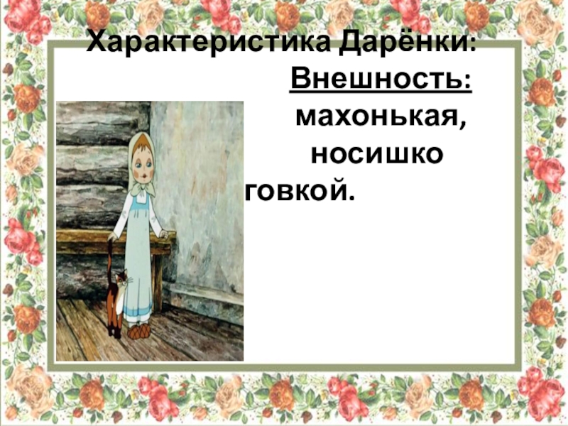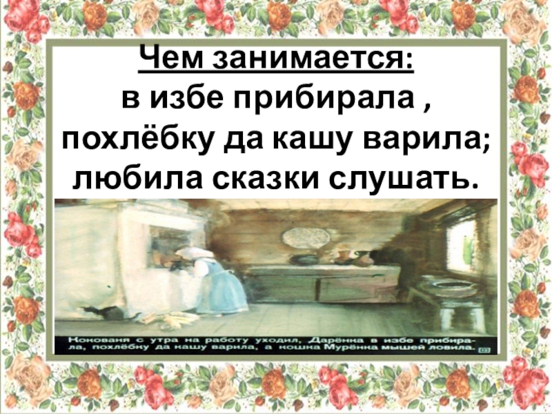 кошка Мурёнка. Жили- поживали, добра много не наживали, а на житьё не плакались, и у всякого дело было. Кокованя с утра на работу уходил, Дарёнка в избе прибирала, похлёбку да кашу варила ,а кошка Мурёнка на охоту ходила – мышей ловила. К вечеру соберутся, и весело им.