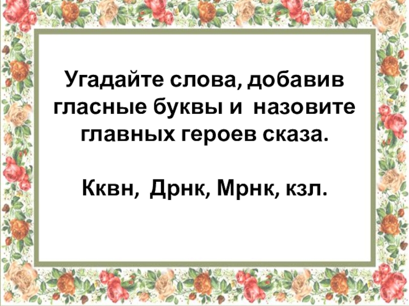 Слайд 11Угадайте слова, добавив гласные буквы и назовите главных героев сказа.