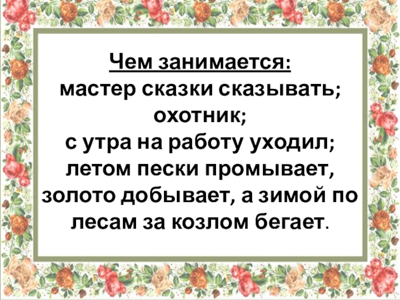 пески промывает, золото добывает, а зимой по лесам за козлом бегает.