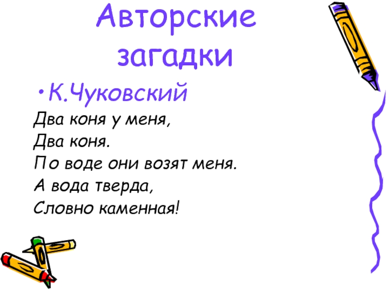 Авторские загадкиК.ЧуковскийДва коня у меня,Два коня.По воде они возят меня.А вода тверда, Словно каменная!