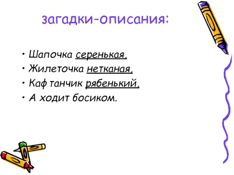 загадки-описания: Шапочка серенькая,Жилеточка нетканая,Кафтанчик рябенький,А ходит босиком.