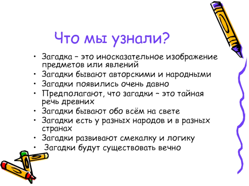 Что мы узнали?Загадка – это иносказательное изображение предметов или явленийЗагадки бывают авторскими и народнымиЗагадки появились очень давноПредполагают,