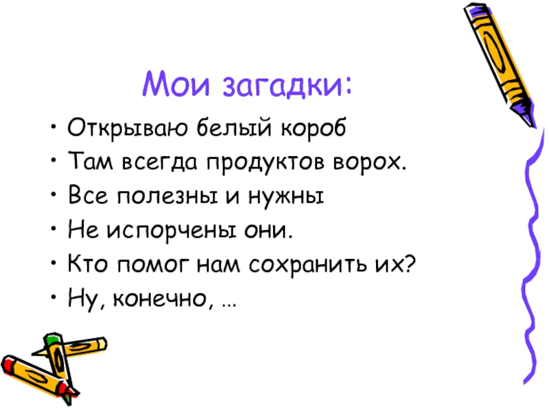 Мои загадки:Открываю белый коробТам всегда продуктов ворох.Все полезны и нужныНе испорчены они.Кто помог нам сохранить их?Ну, конечно,