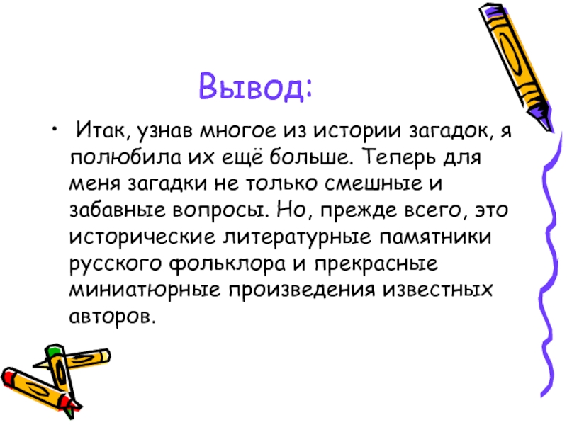 Вывод: Итак, узнав многое из истории загадок, я полюбила их ещё больше. Теперь для меня загадки не