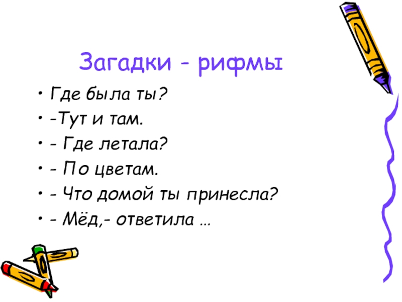 Загадки - рифмыГде была ты?-Тут и там.- Где летала?- По цветам.- Что домой ты принесла?- Мёд,- ответила
