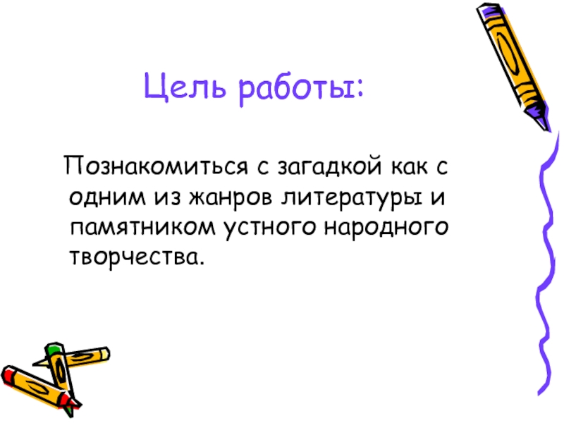 Цель работы:   Познакомиться с загадкой как с одним из жанров литературы и памятником устного народного