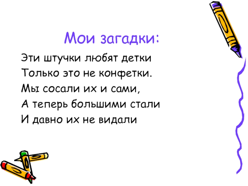 Мои загадки:Эти штучки любят деткиТолько это не конфетки.Мы сосали их и сами,А теперь большими сталиИ давно их