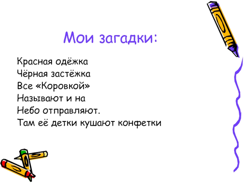 Мои загадки:Красная одёжкаЧёрная застёжкаВсе «Коровкой»Называют и наНебо отправляют.Там её детки кушают конфетки