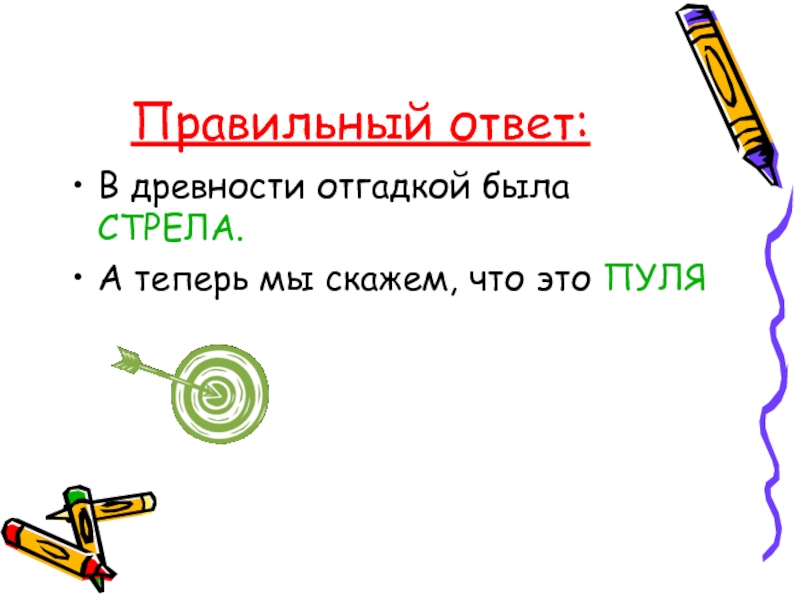 Правильный ответ:В древности отгадкой была СТРЕЛА.А теперь мы скажем, что это ПУЛЯ
