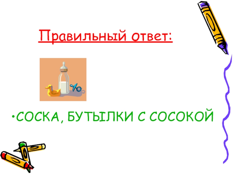 Правильный ответ:СОСКА, БУТЫЛКИ С СОСОКОЙ