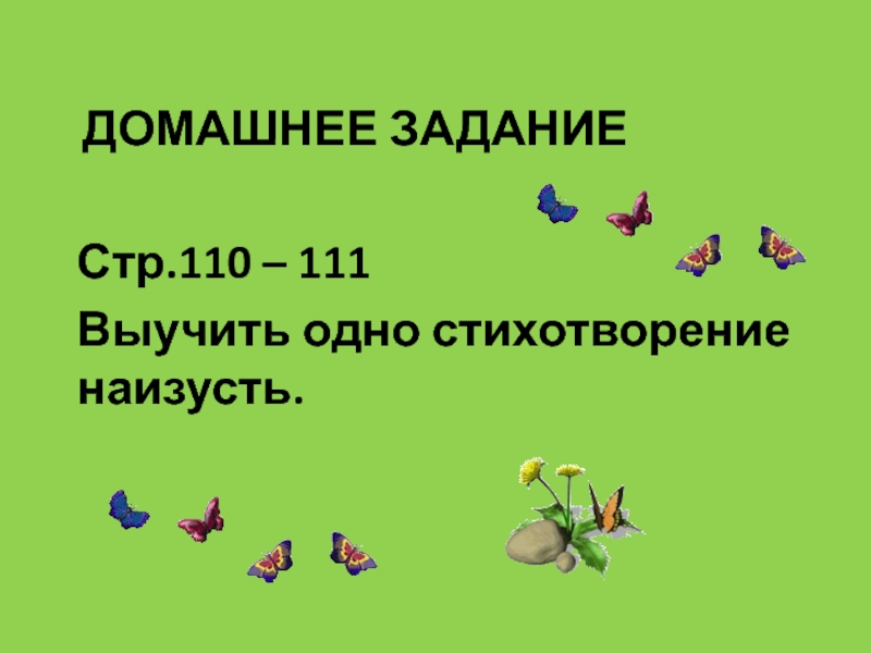 ДОМАШНЕЕ ЗАДАНИЕСтр.110 – 111Выучить одно стихотворение наизусть.