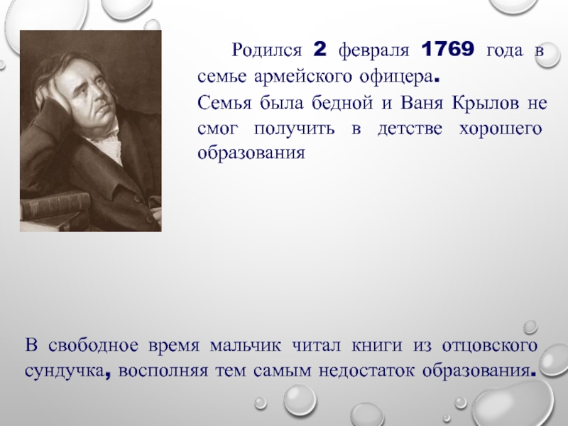 В свободное время мальчик читал книги из отцовского сундучка, восполняя тем самым недостаток образования.