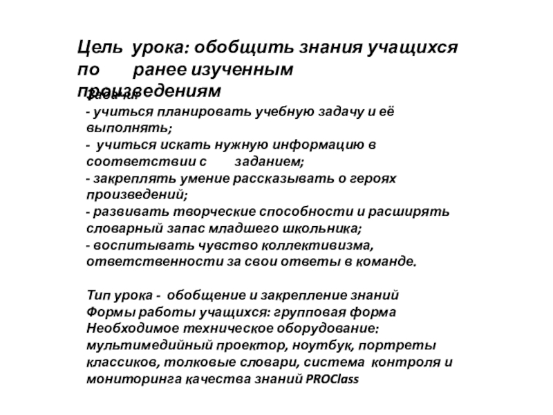 Необходимое техническое оборудование: мультимедийный проектор, ноутбук, портреты классиков, толковые словари, система контроля и мониторинга качества знаний PROClass