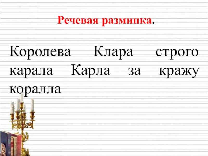 Речевая разминка.Королева Клара строго карала Карла за кражу коралла.
