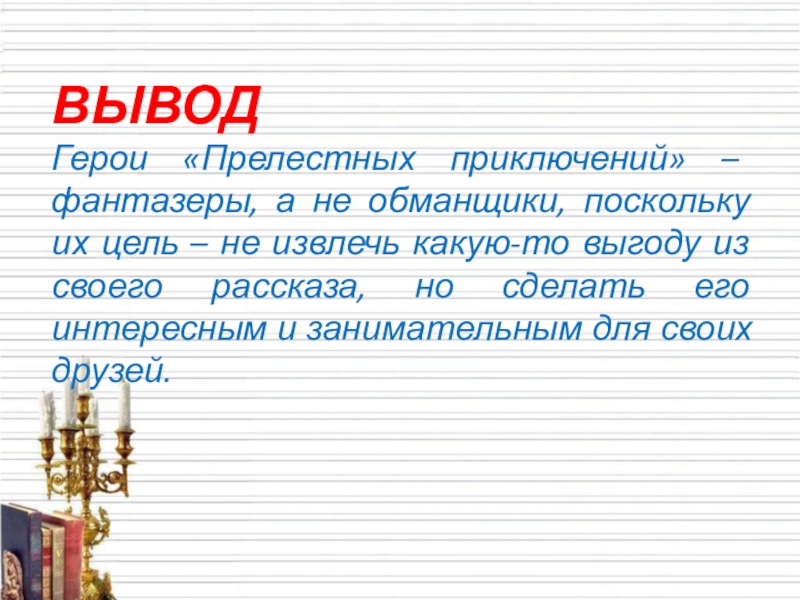 Слайд 10ВЫВОД Герои «Прелестных приключений» – фантазеры, а не обманщики, поскольку их цель