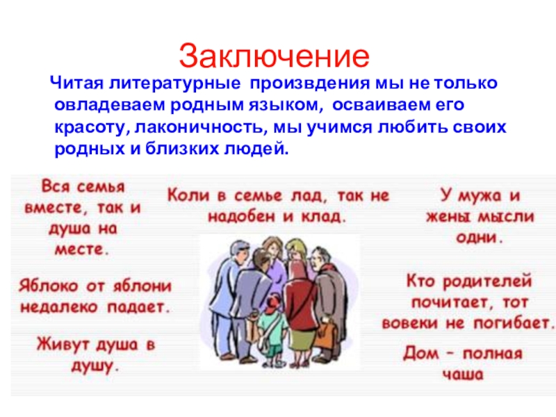 Заключение  Читая литературные произвдения мы не только овладеваем родным языком, осваиваем его красоту, лаконичность, мы учимся