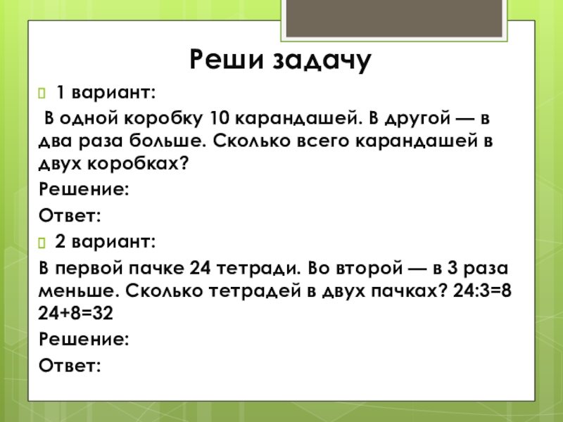В первой пачке 24 тетради. Во второй — в 3 раза меньше. Сколько тетрадей в двух пачках? 24:3=8 24+8=32