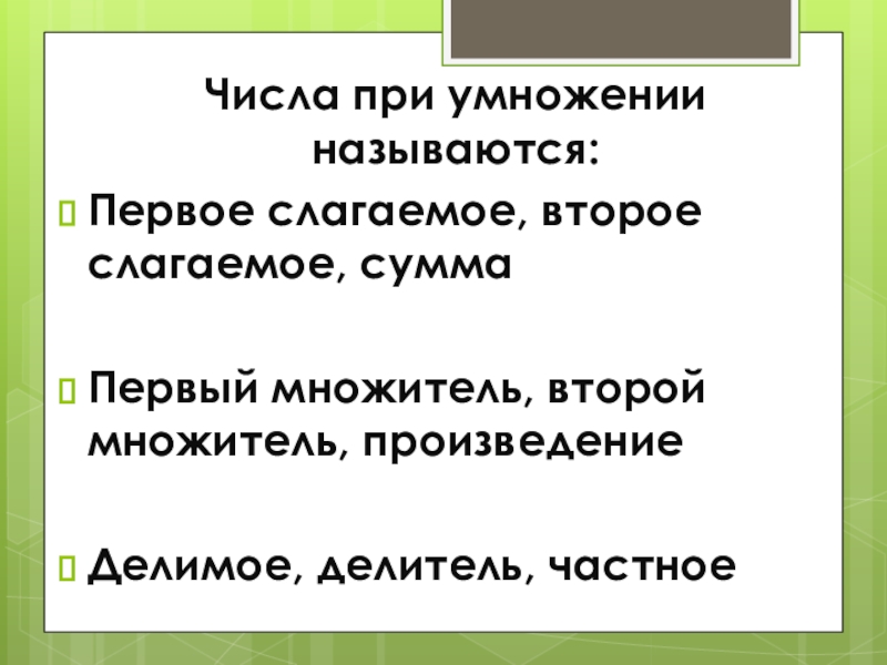 Слайд 18Числа при умножении называются: